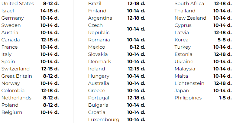 我們通常需要大約1-2個工作日來處理你的訂單。 根據你所在的國家,你可以期待以下交貨時間: